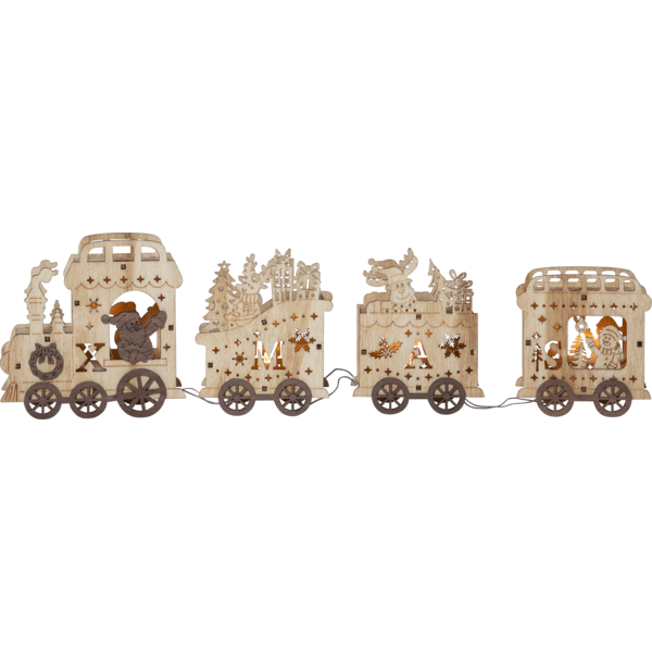 Dekorativt jultåg i trä, gjort i laser cut teknik. Tåget lyser fint, har 3 vagnar och fina detaljer. Ger en fin julstämning i hemmet.