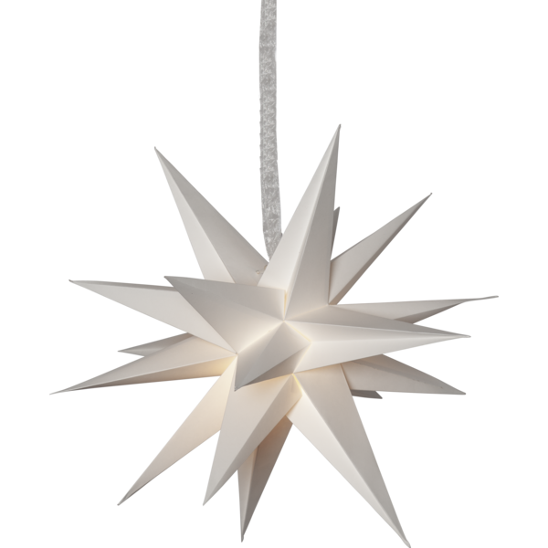 Vit tredimensionell pappersstjärna med 18 st uddar och ett vackert dekorationsband. En fantastisk dekoration över bordet, häng dem en eller flera tillsammans. En stjärna som kan lysa upp under vinterns alla månader inklusive novent, december och självaste julafton. Monteras enkelt ihop med hjälp av dragskon och dekorationsbandet. Lägg till sladdställ och ljuskälla för belysning i stjärnan. Stjärnan är 55 centimeter.