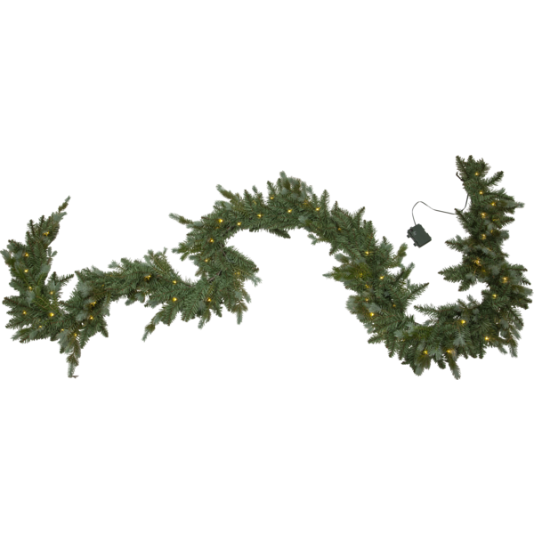 Girlangen Greyland är ca 300 cm i lång och 20 cm bred. Den är tillverkade av en mix av PE tips och PVC tips med ett vackert grå-grönt skimrande utseende. Med 60 små varmvita ljuspunkter lyser den upp vackert både inomhus och utomhus. Slingan kan både lysa konstant eller sättas med timer som lyser upp i 6 timmar och är släckt 18 timmar för att sedan tändas igen nästa dag. Den drivs av 3st AA batterier, de medföljer ej. I samma familj finns även granar och kransar
