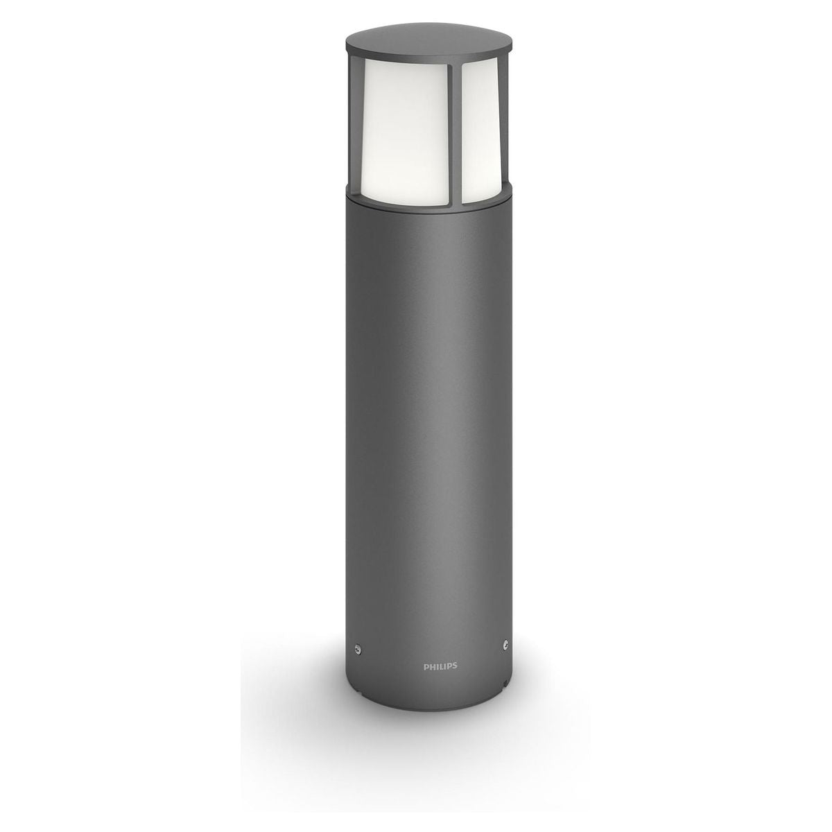 Zewnętrzna lampa cokołowa LED Philips Stock w kolorze antracytowej szarości wykonana jest z wytrzymałego odlewu aluminiowego. Konstrukcja latarni zapewnia 360-stopniową dystrybucję światła, dzięki czemu można oświetlić chodniki i inne obszary na zewnątrz dużą ilością rozproszonego, ciepłego, białego światła.